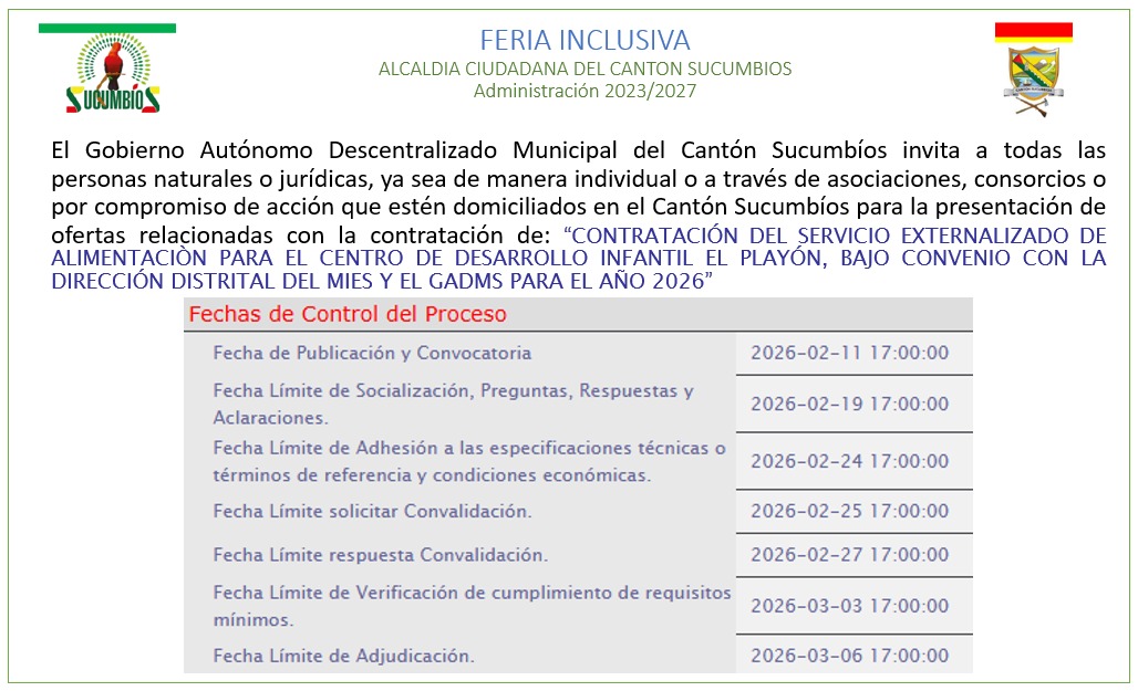 • Feria Inclusiva: Contratación del Servicio Externalizado de Alimentación para el Centro de Desarrollo Infantil el Playón, bajo convenio con la Dirección Distrital del MIES Y EL GADMS para el año 2026