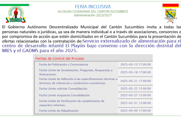 El Gobierno Autónomo Descentralizado Municipal del Cantón Sucumbíos invita a todas las personas naturales o jurídicas, ya sea de manera individual o a través de asociaciones, consorcios o por compromiso de asociación, que estén domiciliadas en el Cantón Sucumbíos, para la presentación de ofertas relacionadas con la contratación de